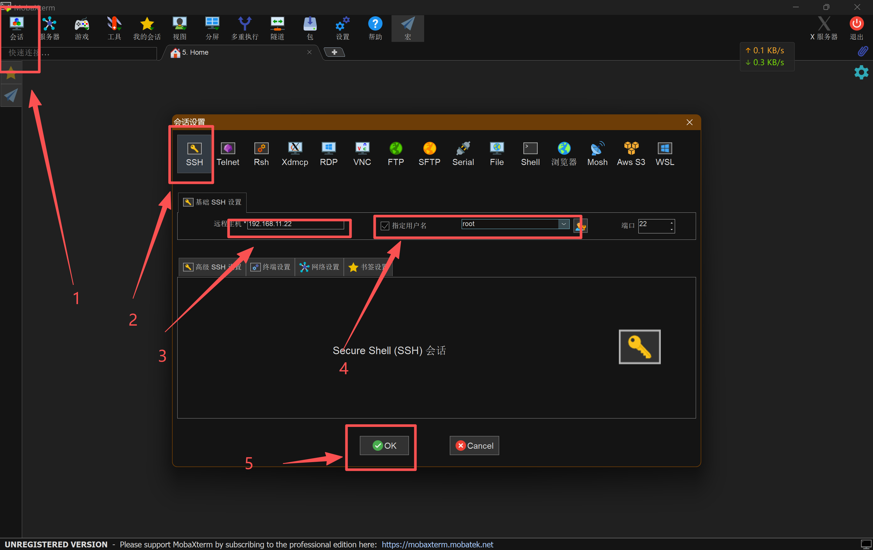 点击左上角的会话 - ssh - 输入远程主机 - 指定用户名 - 确定 - 输入密码